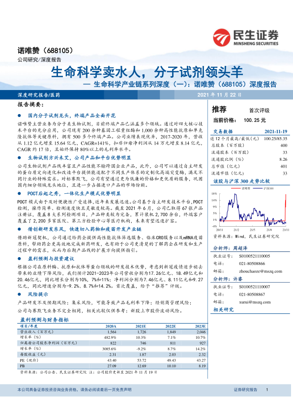 公司展现出卓越的经营业绩,2017年至2020年间,营业收入从1.12亿元激增至15.64亿元,复合年增长率(CAGR)高达141%;同期扣非归母净利润从14万元跃升至8.14亿元,复合增长率约17倍,且毛利率始终保持在80%以上的高水平。在生命科学上游需求持续增长和进口替代加速的双重驱动下,以及POCT市场的蓬勃发展和生物医药研发投入的不断增加,诺唯赞凭借其多元化的产品组合、定制化的服务能力、集研发、生产和销售于一体的生产模式以及持续的创新研发投入,有望进一步巩固其在国内细分领域的龙头地位,并逐步扩大国际市场份额。尽管面临新冠疫情逐步消退可能带来的业绩波动风险,但公司在核心酶原料和POCT领域的深厚技术积累和前瞻性市场布局,为其长期可持续发展奠定了坚实的基础。