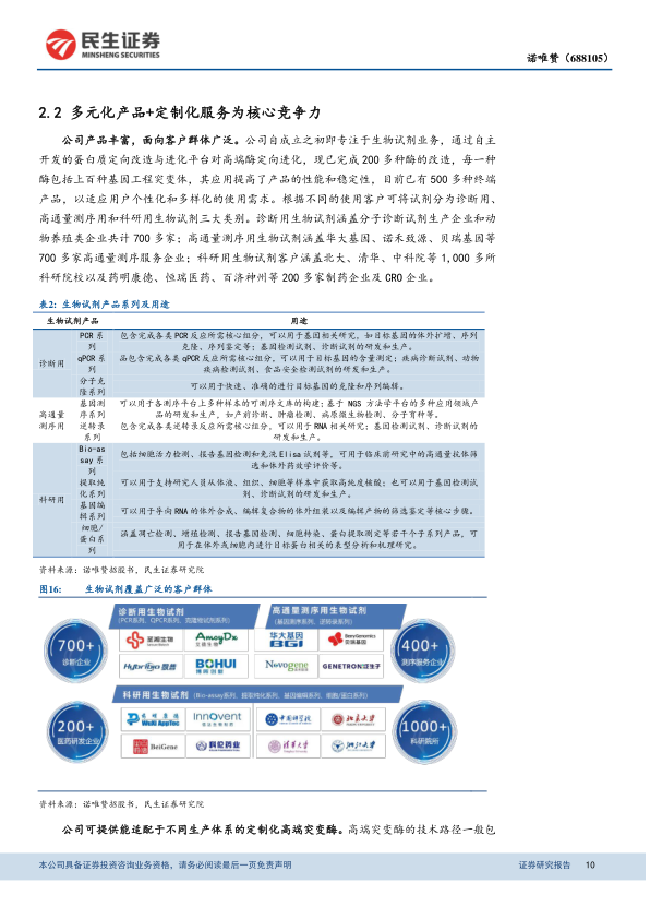 诺唯赞自成立以来便专注于生物试剂业务,通过自主开发的蛋白质定向改造与进化平台,已完成200多种酶的改造,每种酶包含上百种基因工程突变体,显著提高了产品的性能和稳定性。公司目前拥有500多种终端产品,以满足用户个性化和多样化的使用需求。这些试剂根据客户群体可分为诊断用、高通量测序用和科研用生物试剂三大类别,覆盖了700多家分子诊断企业和动物养殖企业、700多家高通量测序服务企业(如华大基因、诺禾致源、贝瑞基因)以及1000多所科研院校(如北大、清华、中科院)和200多家制药及CRO企业(如药明康德、恒瑞医药、百济神州)。