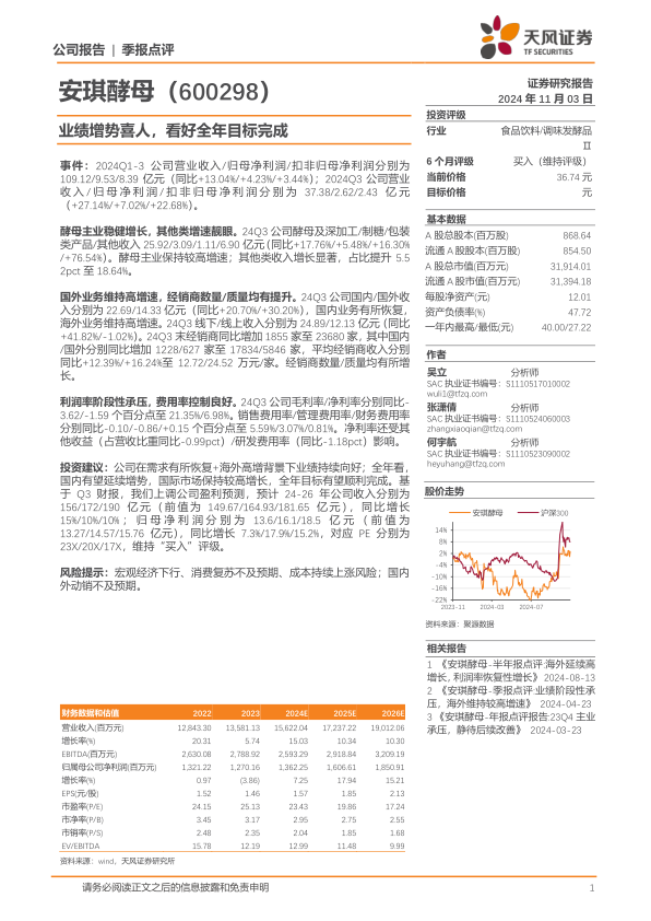 本报告对安琪酵母(600298)2024年第三季度业绩进行了分析,并上调了盈利预测,维持“买入”评级。