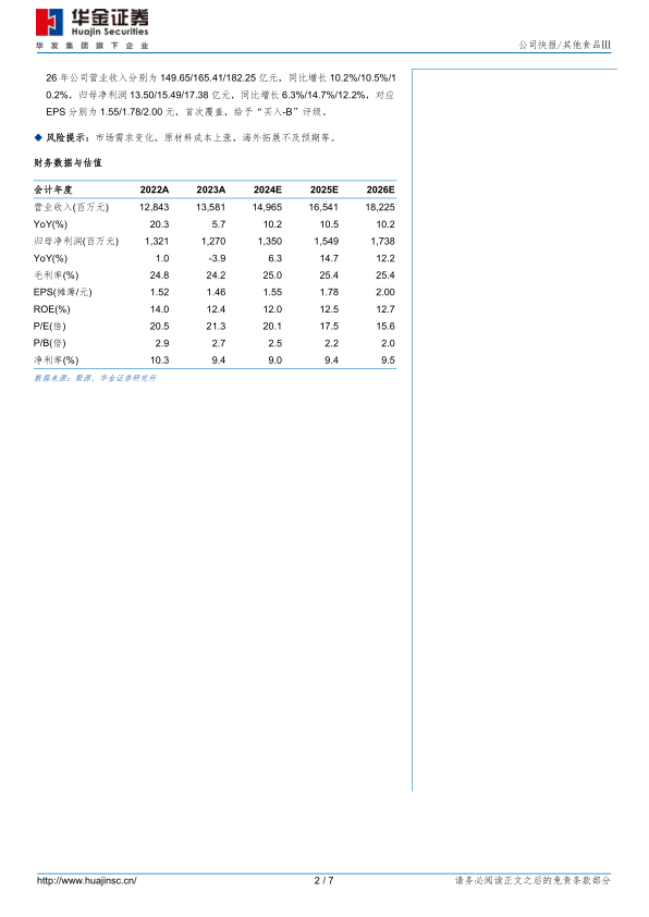 华金证券首次覆盖给予“买入-B”评级。预计2024-2026年公司营业收入分别为149.65亿元、165.41亿元、182.25亿元,同比增长10.2%、10.5%、10.2%。归母净利润分别为13.50亿元、15.49亿元、17.38亿元,同比增长6.3%、14.7%、12.2%。对应EPS分别为1.55元、1.78元、2.00元。