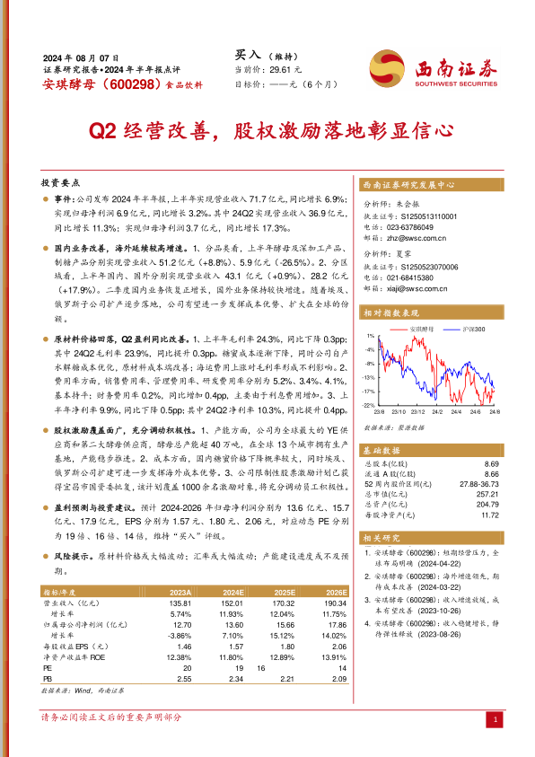 本报告对安琪酵母2024年半年报进行了深度分析,核心观点如下: