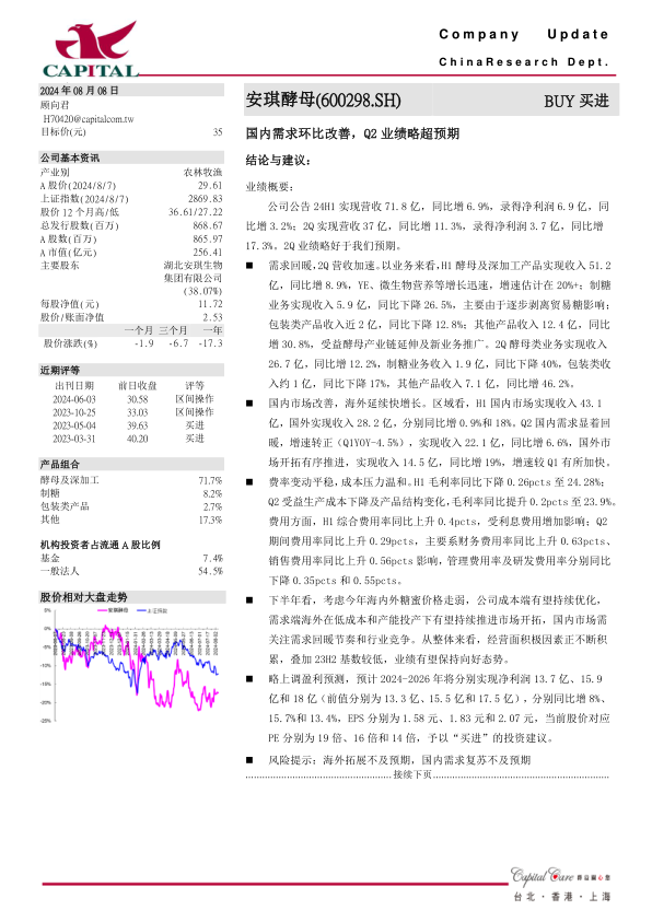 本报告分析了安琪酵母2024年上半年的业绩表现,指出公司Q2业绩略超预期,主要受益于国内需求回暖和海外市场拓展。报告详细分析了公司各项业务和区域市场的表现,并对公司未来的盈利能力进行了预测,维持“买进”的投资建议。同时,报告也提示了海外拓展和国内需求复苏不及预期的风险。总体来看,安琪酵母经营面积极因素不断积累,业绩有望保持向好态势。