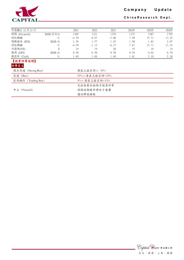 略上调盈利预测,预计2024-2026年将分别实现净利润13.7亿、15.9亿和18亿(前值分别为13.3亿、15.5亿和17.5亿),分别同比增8%、15.7%和13.4%,EPS分别为1.58元、1.83元和2.07元,当前股价对应PE分别为19倍、16倍和14倍,予以“买进”的投资建议。
