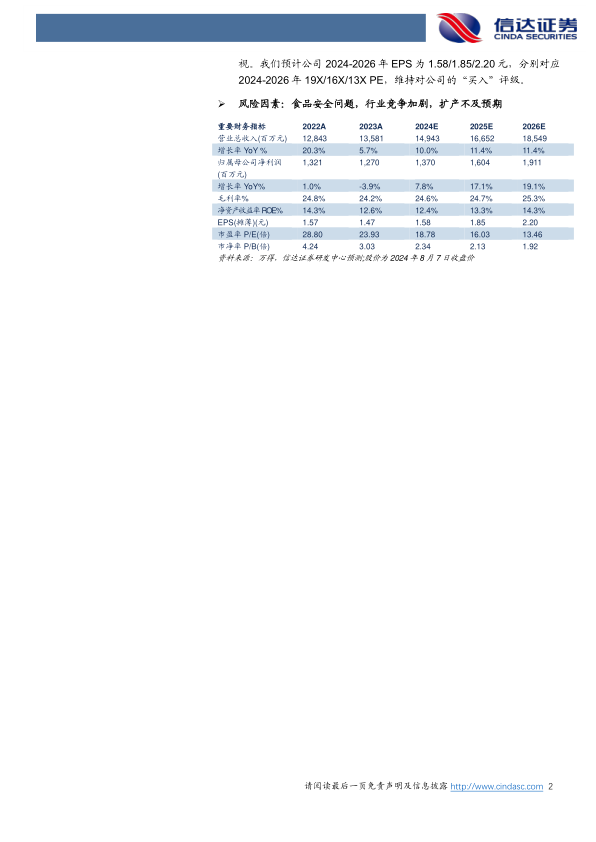 主要风险包括食品安全问题、行业竞争加剧以及扩产不及预期。