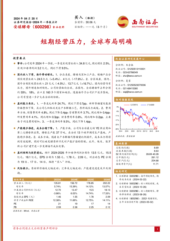 安琪酵母2024年一季报显示,公司短期经营面临压力,但全球化布局和成本控制措施有望改善未来盈利能力。国内市场收入下滑是主要挑战,而海外市场增长迅速,为公司提供了增长动力。随着自产水解糖比例提升和海外产能扩张,成本压力有望缓解。维持“买入”评级,但投资者应关注原材料价格、汇率波动和产能建设进度等风险因素。