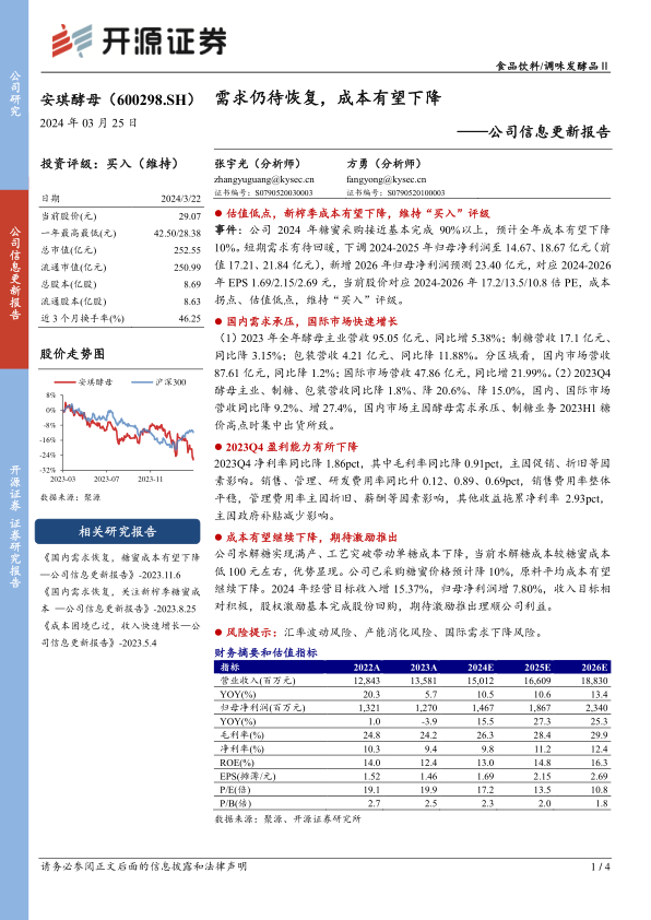 公司2024年糖蜜采购接近完成,预计全年成本有望下降10%。短期需求有待回暖,因此下调2024-2025年归母净利润预测,并新增2026年盈利预测。