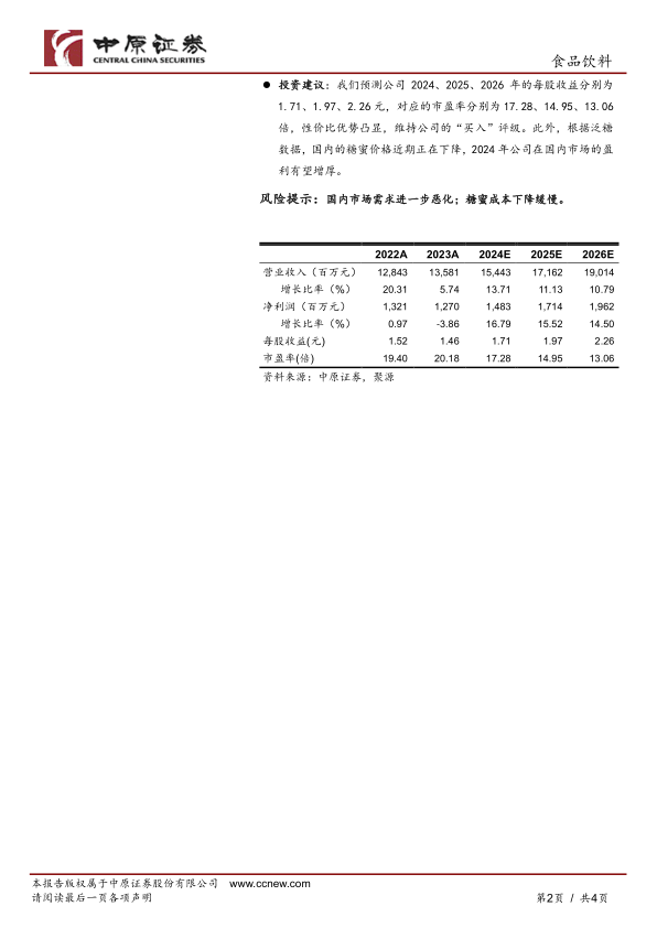 投资建议:我们预测公司2024、2025、2026年的每股收益分别为1.71、1.97、2.26元,对应的市盈率分别为17.28、14.95、13.06倍,性价比优势凸显,维持公司的“买入”评级。此外,根据泛糖数据,国内的糖蜜价格近期正在下降,2024年公司在国内市场的盈利有望增厚。