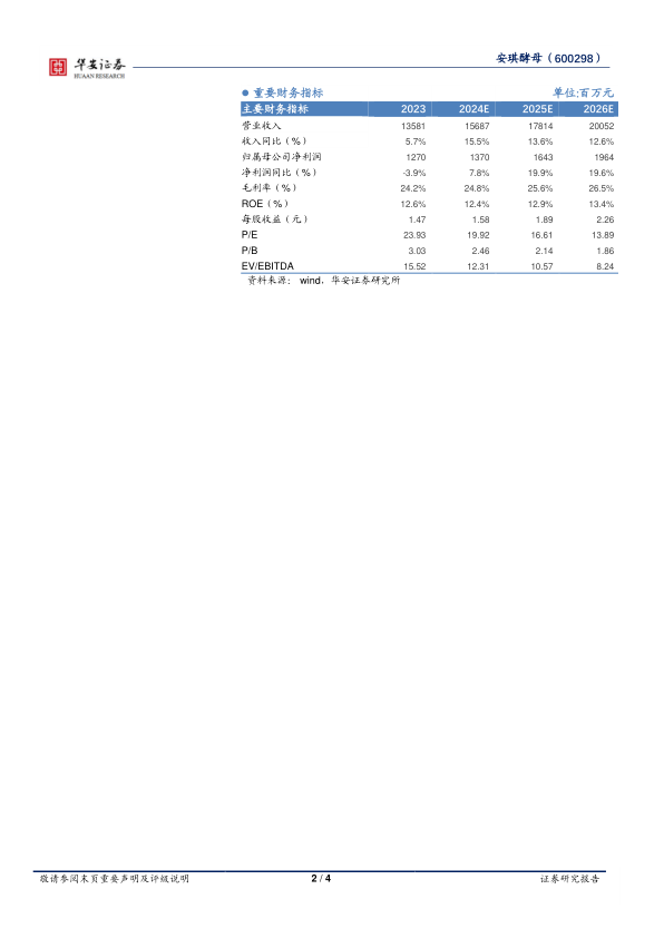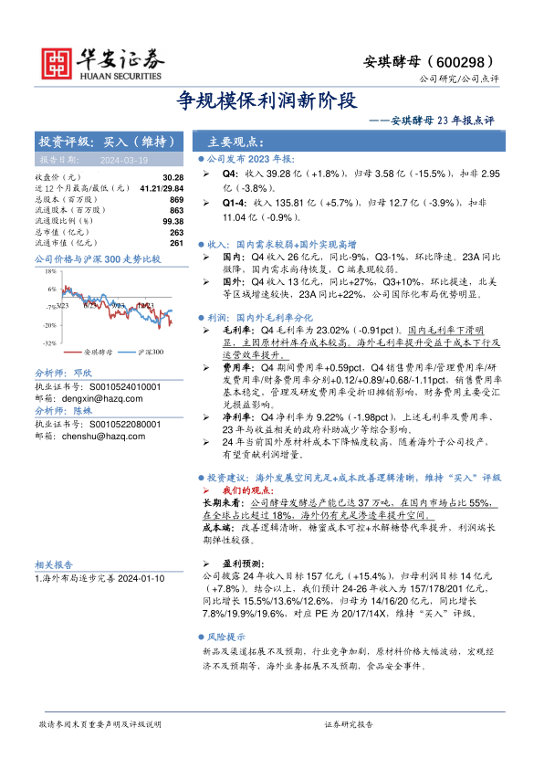 本报告对安琪酵母2023年年报进行了深入分析,核心观点如下: