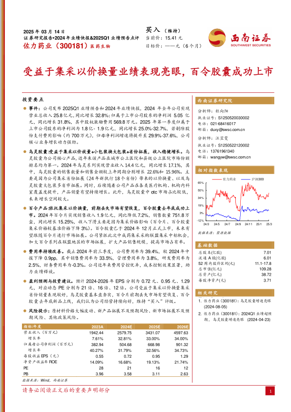 预计 2024-2026年 EPS分别为 0.72元、0.95元、1.29元,对应动态 PE分别为 21倍、16倍、12倍。公司受益于集采以价换量集采省份销量表现较好,乌灵胶囊基本盘夯实,百令片前期丢失市场有望恢复、百令胶囊去年底新品上线,我们认为公司经营持续向好,维持“买入”评级。