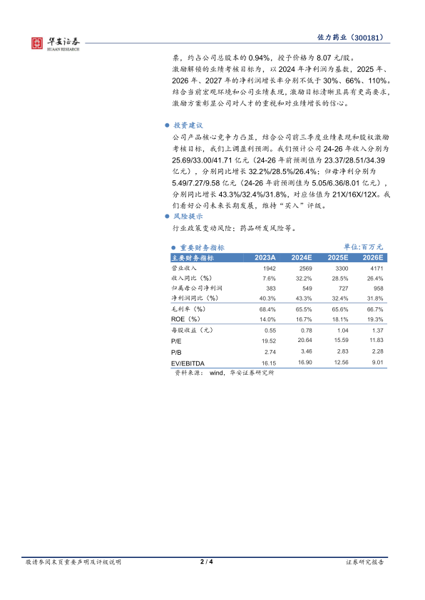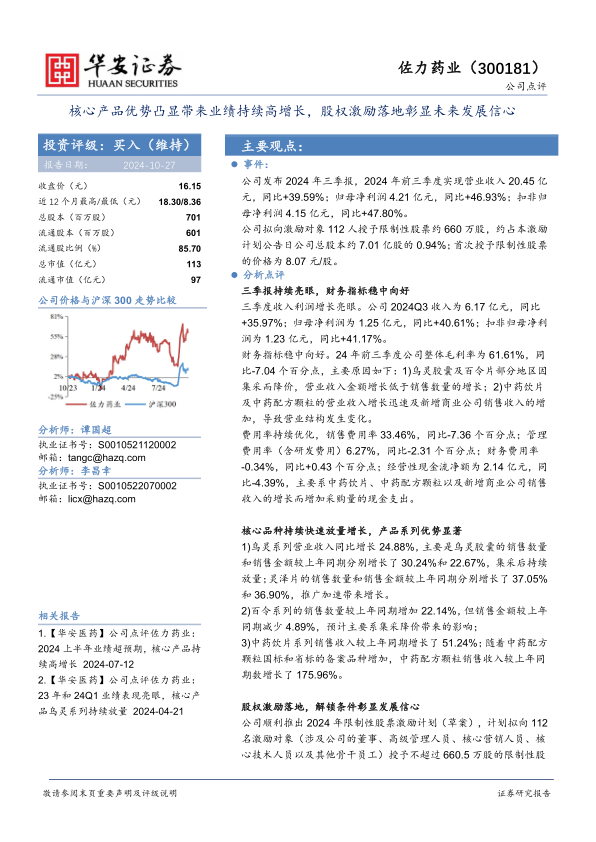 本报告通过对佐力药业2024年三季报的分析,认为公司核心产品优势显著,业绩持续高增长,股权激励计划的推出进一步增强了公司发展的信心。报告上调了对公司未来盈利的预测,维持“买入”评级。同时,报告也提示了行业政策变动和药品研发等风险。