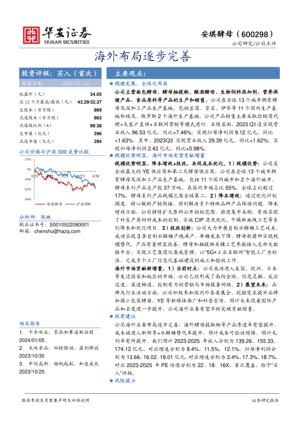 本报告对安琪酵母(600298)进行了首次覆盖,给予“买入”评级。核心观点如下: