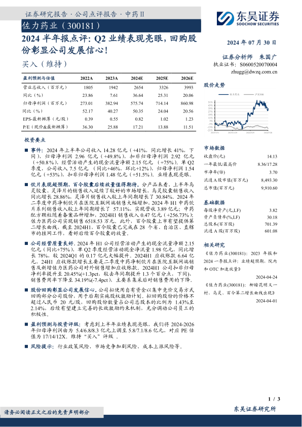 报告强调,饮片业务表现超预期,百令胶囊上市有望提供新的增长动力。同时,公司经营质量良好,现金流大幅提升,股份回购彰显公司发展信心。维持“买入”评级,并上调了2024-2026年归母净利润预期。