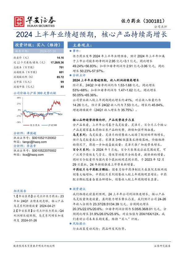 我们维持此前盈利预测,24上半年公司利润快速增长,核心产品乌灵胶囊快速放量,盈利能力增长势头凸显,我们预计公司24-26年收入分别为23.37/28.51/34.39亿元,分别同比增长20.3%/22.0%/20.6%;归母净利润分别为5.05/6.36/8.01亿元,分别同比增长31.9%/26.0%/25.9%,对应估值为20X/16X/12X。我们看好公司未来长期发展,维持“买入”评级。
