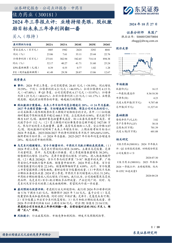 佐力药业在2024年前三季度展现出卓越的业绩增长,营收和归母净利润均实现高速增长,超出市场预期。公司通过落地股权激励方案,设定了未来三年净利润翻番的宏伟目标,彰显了管理层对公司未来发展的强大信心。在产品层面,公司战略聚焦乌灵系列、百令系列以及中药饮片和配方颗粒,实现了多品种的协同放量。乌灵胶囊通过集采和OTC渠道拓展稳步增长,灵泽片快速爬坡;百令片销量回升,百令胶囊作为第二增长曲线即将发力;中药饮片和配方颗粒业务更是实现爆发式增长。公司凭借药用真菌生物发酵技术,在产品质量和市场应用方面具备独特优势。尽管分析师对2024年净利润预测略有下调,但上调了2026年预测,并基于公司强劲的增长潜力、合理的估值(PEG不足1),维持“买入”评级。同时,报告也提示了行业政策、市场竞争和研发等潜在风险。