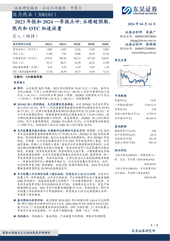 盈利预测与投资评级:我们维持2024-2025年归母净利润5.4/6.8亿元的预期,预计2026年归母净利润为8.3亿元,2024-2026年P/E估值为19/15/12X;基于公司1)乌灵胶囊集采影响边际减弱,OTC不断扩展;2)百令胶囊上市后百令系列恢复增长;3)灵泽片维持放量;维持“买入”评级。