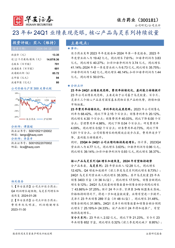 23年和24Q1业绩表现亮眼,费用率持续优化,盈利能力持续提升23年公司业绩表现亮眼,主要是由于公司基于乌灵胶囊、百令片、灵泽片三个核心产品具有国家基本药物目录产品的优势,持续加强市场拓展。