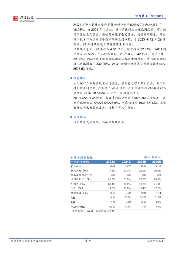 公司核心产品乌灵胶囊快速放量,盈利能力增长势头凸显。我们维持此前盈利预测,并新增了26年预测,我们预计公司24-26年收入分别为23.37/28.51/34.39亿元,分别同比增长