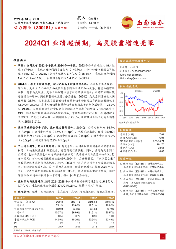 2024年一季度业绩超预期,核心产品乌灵胶囊增速亮眼。公司基于乌灵胶囊、百令片、灵泽片三个核心产品是国家基本药物目录产品的优势,持续加强市场拓展,其中乌灵胶囊、灵泽片的销售延续了较好的市场增长;中药配方颗粒随着备案品种增加,同比销售增长显著。分品类看,2024Q1乌灵系列营业收入同比增长35.3%,主要是乌灵胶囊的销售数量和销售金额较上年同期分别增长了43.9%和37.3%;灵泽片的销售数量和销售金额较上年同期分别增长了25.2%和24.3%;百令片的销售数量和销售金额较上年同期分别增长7.1%和减少了19%;随着配方颗粒国标省标备案的增加,中药配方颗粒收入较上年同期增长了333%;中药饮片收入较上年同期增长了25.5%;新增佐力医药公司商业销售收入2598.5万元。