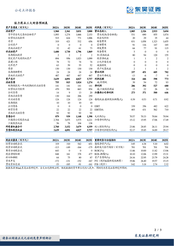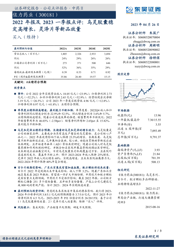 佐力药业2022年报和2023年一季报显示公司业绩稳健增长,盈利能力持续增强。核心产品乌灵胶囊稳定增长,新产品灵泽片放量,百令片有望受益于集采,配方颗粒业务蓄势待发。尽管考虑到集采风险,略微调整了盈利预测,但公司整体发展态势良好,维持“买入”评级。