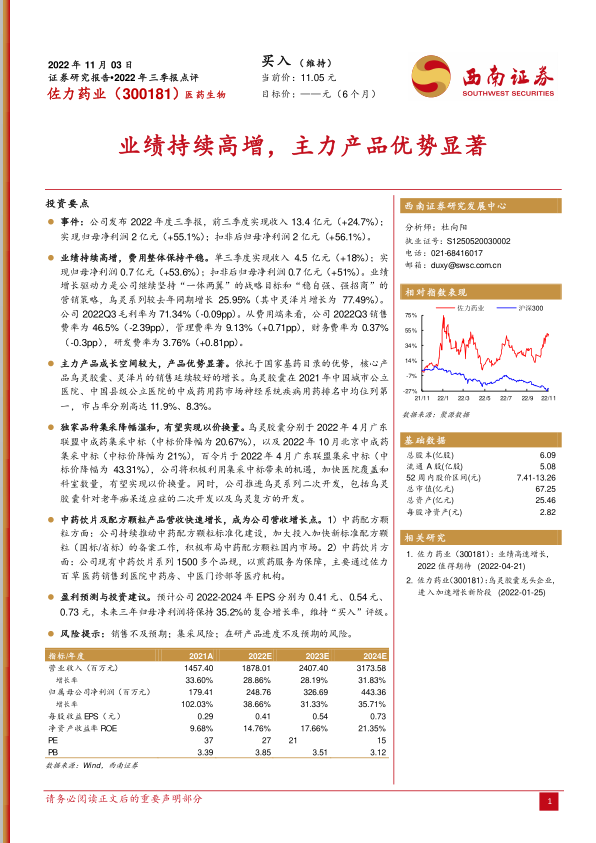 佐力药业2022年三季报显示,公司业绩持续高增,核心产品优势显著,集采影响积极,多元增长动力显现。报告维持“买入”评级,并提示了相关风险。公司未来发展值得期待。