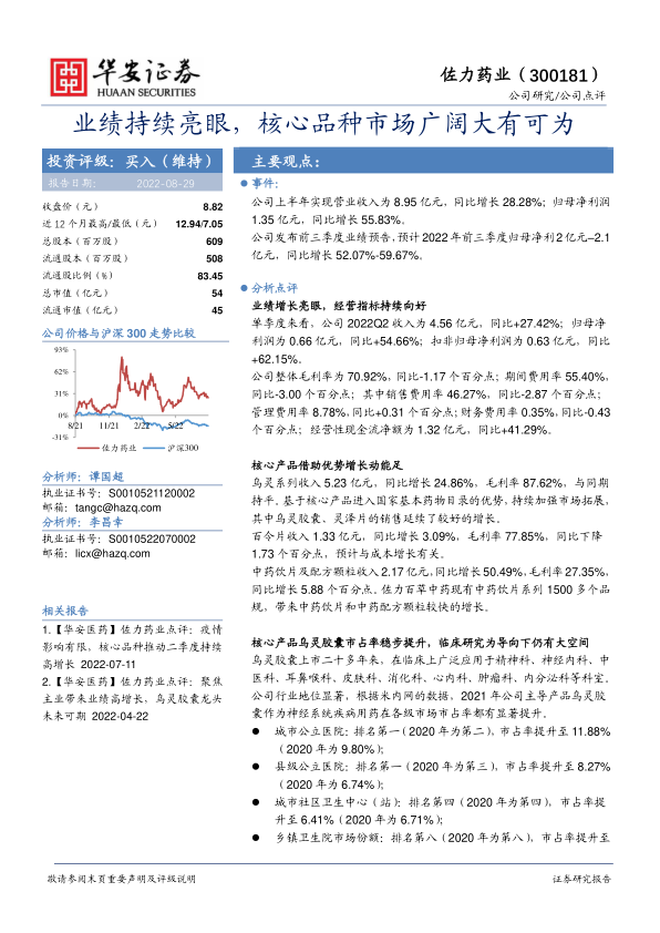 公司发布前三季度业绩预告,预计2022年前三季度归母净利2亿元–2.1亿元,同比增长52.07%-59.67%;扣非净利润为1.94-2.05亿元。预计第三季度归母利润为6,511.28万元–7,511.28万元,比上年同期增长:44.83%-67.08%;扣非净利润为6,335.66万元–7,455.66万元,比上年同期增长:42.57%-67.77%。公司分析,主要是公司核心产品乌灵胶囊、灵泽片销售收入比去年同期有较大增长;同时中药饮片及配方颗粒继续加强业务拓展,销售收入比去年同期有较好增长。不过受湖北联盟集采影响,三季度百令片销售有所影响。费用端公司贷款规模有所降低导致利息费用减少,同时利息收入也有所增加,财务费用较去年同期降低。
