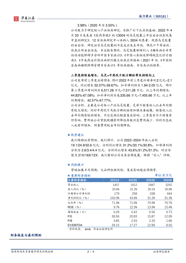 本报告的核心观点是佐力药业的业绩持续亮眼,尤其是在核心品种乌灵胶囊的带动下,市场潜力巨大。公司通过加强市场拓展和临床研究,不断巩固和提升市场地位,未来发展可期。