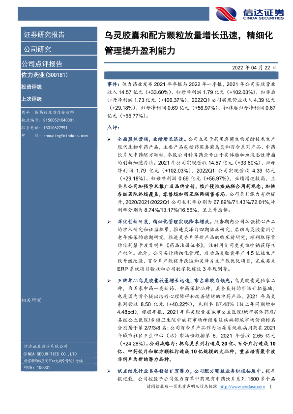 佐力药业(300181)事件:佐力药业发布2021年年报与2022年一季报,2021年公司实现营业收入14.57亿元(+33.60%)、归母净利润1.79亿元(+102.03%)、扣非后归母净利润1.73亿元(+106.37%);2022Q1公司实现营业收入4.39亿元(+29.18%)、归母净利润0.69亿元(+56.97%)、扣非后归母净利润0.67亿元(+55.77%)。