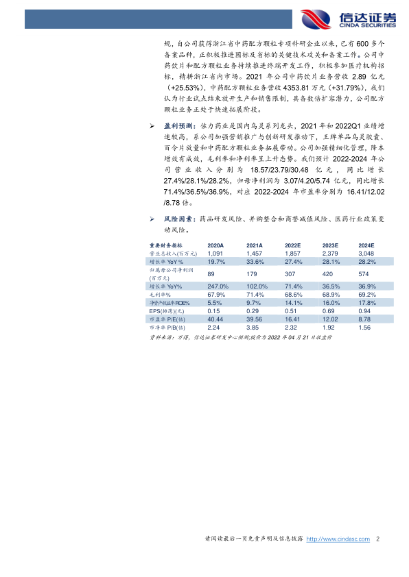 盈利预测:佐力药业是国内乌灵系列龙头,2021年和2022Q1业绩增速较高,系公司加强营销推广与创新研发推动下,王牌单品乌灵胶囊、百令片放量和中药配方颗粒业务拓展带动。公司加强精细化管理,降本增效有成效,毛利率和净利率呈上升态势。我们预计2022-2024年公司营业收入分别为18.57/23.79/30.48亿元,同比增长27.4%/28.1%/28.2%,归母净利润为3.07/4.20/5.74亿元,同比增长71.4%/36.5%/36.9%,对应2022-2024年市盈率分别为16.41/12.02/8.78倍。