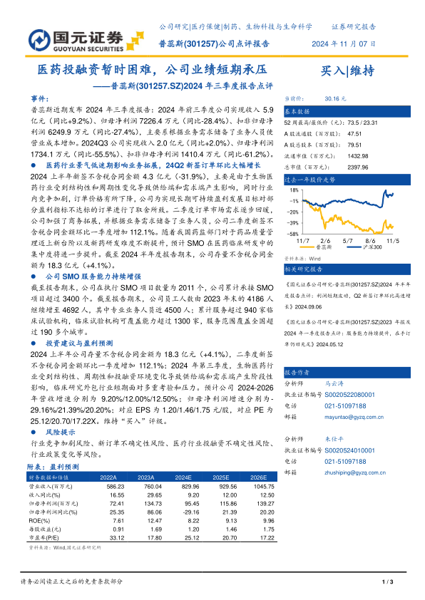 国元证券维持对普蕊斯的“买入”评级。尽管2024年第三季度生物医药行业受到结构性、周期性和投融资环境变化的多重影响,临床研究外包行业短期面临考验和压力,但公司在手订单充足且二季度新签订单环比显著增长。预计公司2024-2026年营收增速分别为9.20%、12.00%和12.50%。归母净利润增速预计分别为-29.16%、21.39%和20.20%,表明2024年利润承压后,2025年和2026年将恢复增长。对应EPS分别为1.20元/股、1.46元/股和1.75元/股,对应PE分别为25.12X、20.70X和17.22X。