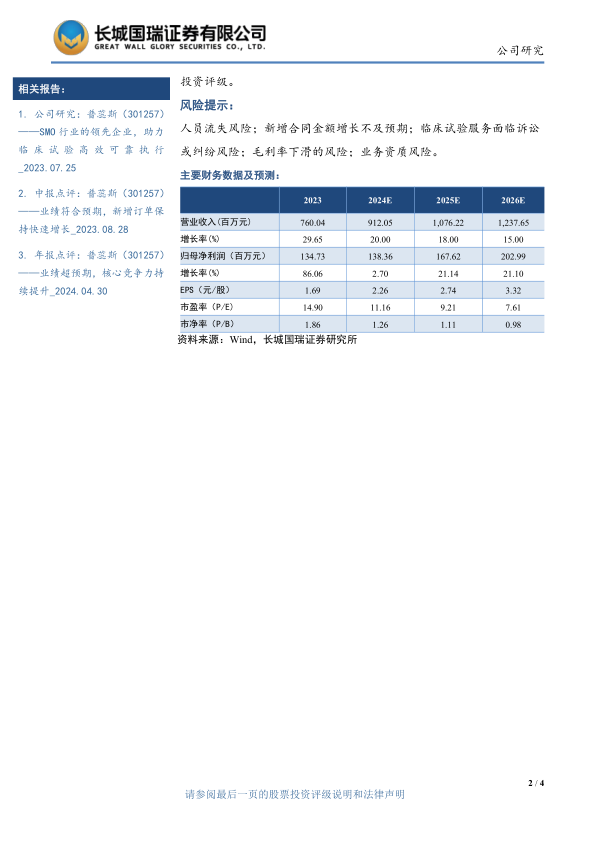考虑公司当前毛利率较2023年有所下滑且政府补助的可持续性具有不确定性,我们下调公司2024-2026年的归母净利润分别为1.38(前值1.62)/1.68(前值1.95)/2.03(前值2.23)亿元,EPS分别为2.26(前值2.65)/2.74(前值3.18)/3.32(前值3.64)元,当前股价对应PE为11/9/8倍。考虑公司作为国内领先的SMO企业,覆盖临床机构范围广,营收持续扩张,新增订单金额环比显著增长,将受益于SMO在医药临床研发中的渗透率将进一步提升以及SMO行业集中度提升,我们维持其“买入”投资评级。