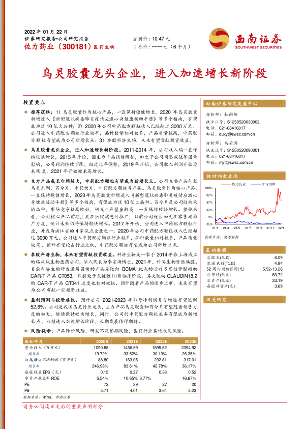 盈利预测与投资建议。预计公司2021-2023年归母净利润复合增速有望达到52.8%。公司是我国乌灵行业龙头,主力产品乌灵胶囊和百令片有望随着销售力度的加大,继续保持较快增长,同时,公司的中药配方颗粒业务有望成为新增长点,业绩进入加速增长阶段,长期发展值得期待。