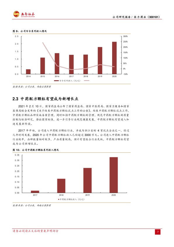 主力产品成长空间较大,中药配方颗粒有望成为新增长点。公司主要产品包括乌灵系列、百令片、中药饮片、中药配方颗粒等产品。乌灵胶囊作为核心产品,一直保持稳健增长,2020年乌灵胶囊新增进入《新型冠状病毒肺炎疫情应激心身健康援助手册》等多个指南,有望成为过10亿大品种。百令片是公司收购来的品种,市场竞争格局较好,研发生产壁垒较高,一直保持较快增长。整体来看,公司核心产品前期主要在医院端进行推广,目前公司逐步加大在零售端推广力度,预计未来仍将保持较快增长。2017年开始,公司进入中药配方颗粒行业,并成为浙江省的4家试点企业之一,2020年公司中药配方颗粒收入已经超过3000万元。公司进入中药配方颗粒行业较早,品种数量相对较多,产品质量较高,预计有望抢占行业先机,中药配方颗粒有望成为公司新增长点。