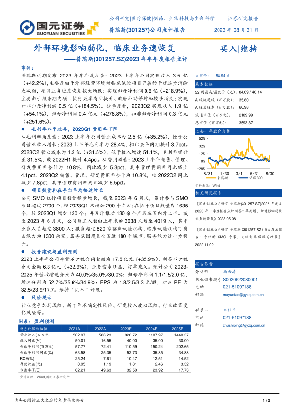 本报告分析了普蕊斯2023年半年度报告,指出公司受益于外部环境改善,临床业务快速恢复,业绩实现大幅增长。毛利率水平显著改善,费用率有效下降,盈利能力显著提升。同时,公司SMO执行项目数量和在手订单均快速增长,为未来业绩增长奠定基础。维持“买入”评级,并预测公司未来三年营收和净利润将保持高速增长。