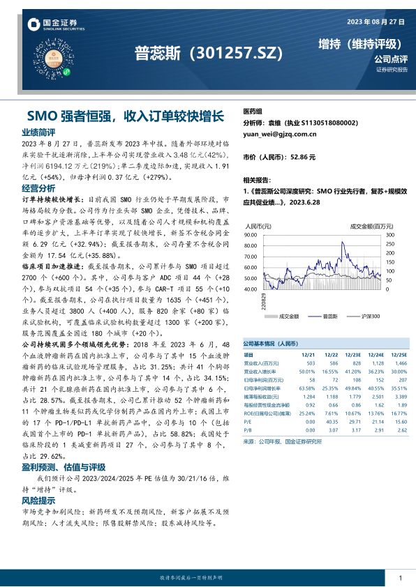 本报告分析了普蕊斯2023年中报,指出公司业绩增长迅速,订单充足,在 SMO 行业强者恒强。公司在多个治疗领域的新药临床试验中占据领先地位,并积极参与创新药物的研发。维持“增持”评级,但同时也提示了市场竞争、研发风险、人才流失等风险因素。