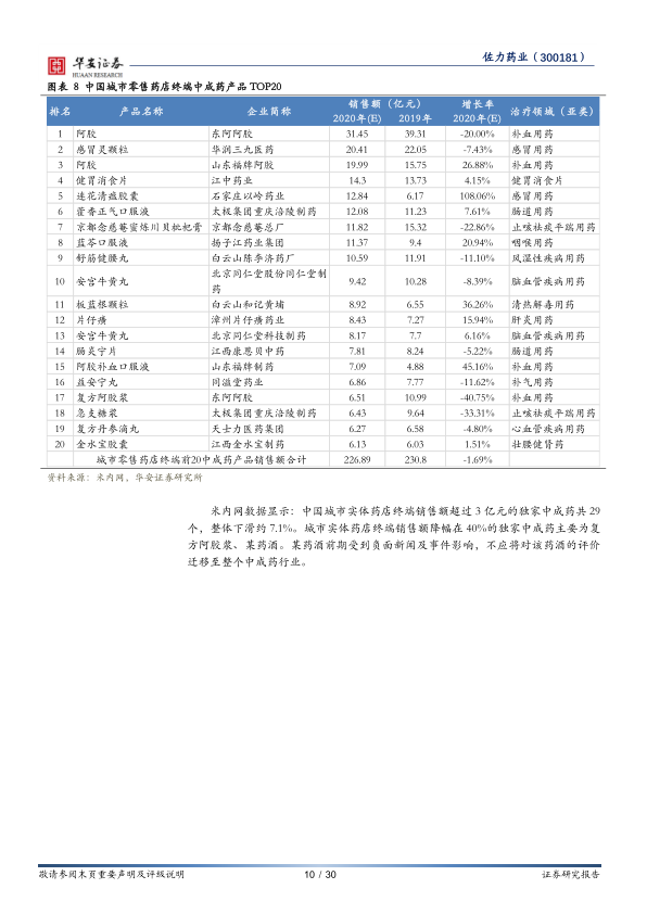 我们认为,虽然中药行业没有表现出高景气,但是在目前国家支持中药的政策以及国民对中药产品普遍接受的大背景下(特别是2020新冠疫情初期全球缺少特效药时,中成药发挥出了其强大的支持作用),至少中短期,中成药行业不会出现明显萎缩。国家统计局数据显示:中成药2019年营收约4587亿元,同比增长7.5%,占医药工业比重约17.5%。2019年中成药实现利润约593亿元,同比下滑约1.8%。占医药工业比重约17.2%,行业净利率约12.9%。2020年中成药行业整体表现平稳。米内网数据显示:中国城市零售药店终端中成药产品TOP20产品销售额下滑1.69%。中国城市实体药店终端销售额超过3亿元的独家中成药整体下滑约7.1%。