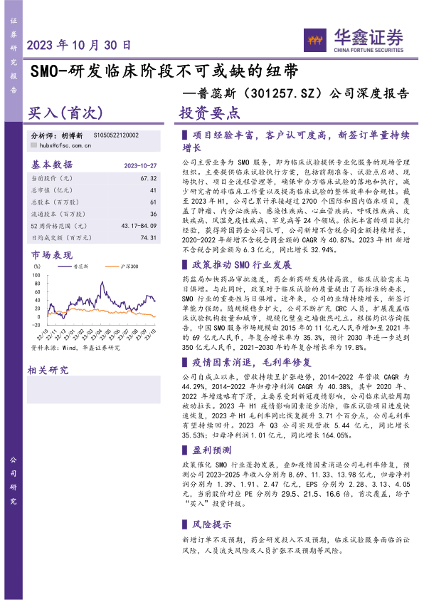 本报告对普蕊斯公司进行了深度分析,认为公司作为国内领先的SMO服务提供商,在政策推动、疫情消退和行业集中度提升的背景下,凭借其丰富的项目经验、客户认可度和持续增长的新签订单量,以及规模化高质量的服务团队,未来发展前景广阔,具有较高的投资价值。