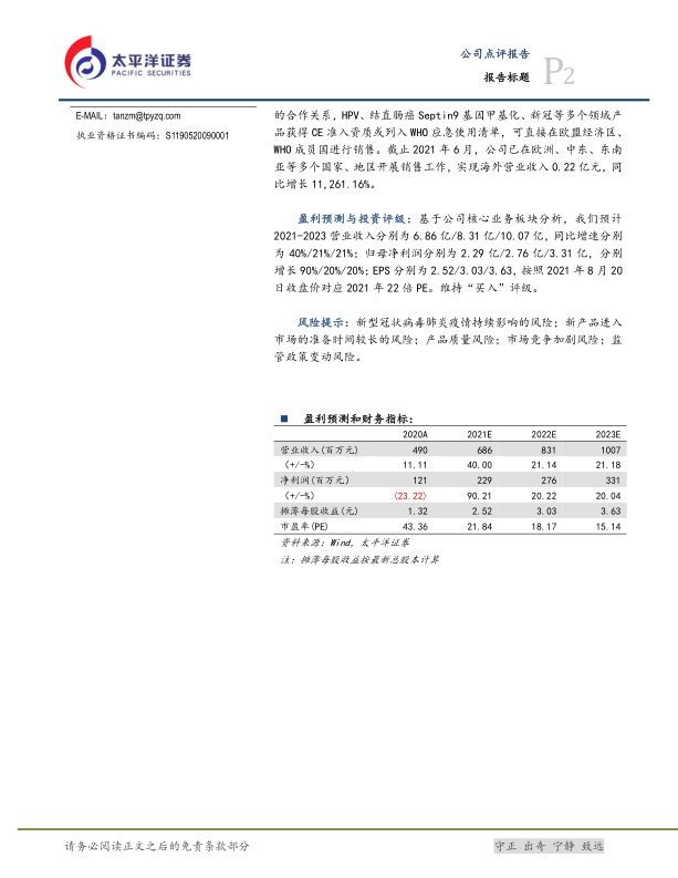 2) 不断探索海外市场,多款产品获国外机构准入许可: 公司不断探索海外市场,积极拓宽海外经销渠道,已与海外经销商建立稳固的合作关系, HPV、结直肠癌 Septin9 基因甲基化、新冠等多个领域产品获得 CE 准入资质或列入 WHO 应急使用清单,可直接在欧盟经济区、WHO 成员国进行销售。截止 2021 年 6 月,公司已在欧洲、中东、东南亚等多个国家、地区开展销售工作,实现海外营业收入 0.22 亿元,同比增长 11,261.16%。