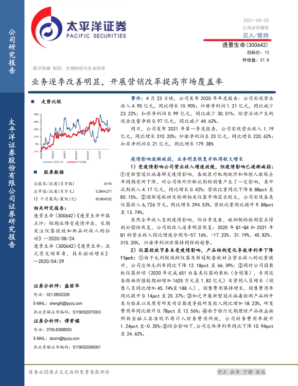 本报告分析了透景生命(300642)在2020年受疫情影响后,业务逐季改善的趋势,以及2021年一季度业绩的大幅增长。报告指出,公司通过营销改革提高市场覆盖率,并在海外市场实现零的突破。