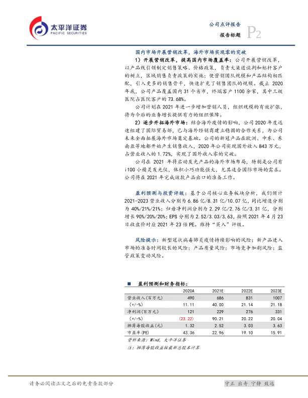 公司在 2021 年将启动发光产品的海外市场布局,特别是公司有i100 小精灵发光仪,体积小巧功能强大,尤其适合国际市场的需求。公司将在 2021 年完成该款产品出口的准备工作。