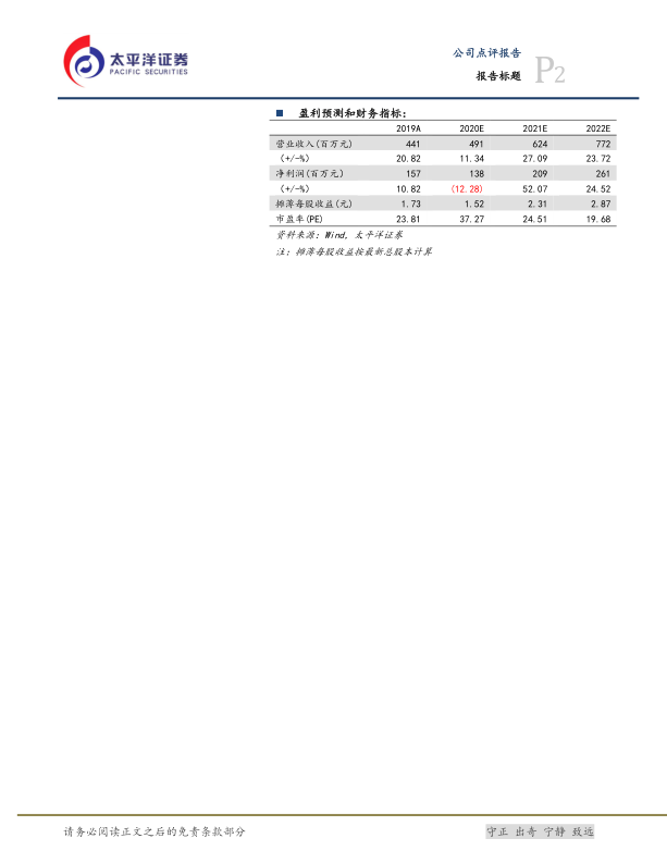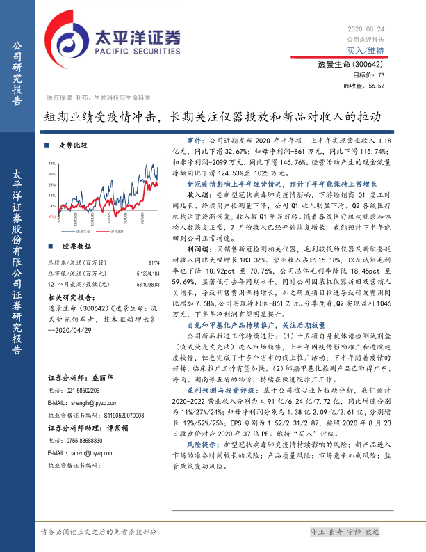 本报告对透景生命2020年半年度业绩进行了分析,认为公司短期业绩受到疫情影响,但长期增长动力依然存在。报告详细分析了公司各项业务的进展情况,并对未来业绩进行了预测,维持“买入”评级。同时,报告也提示了投资者需要关注的风险因素。