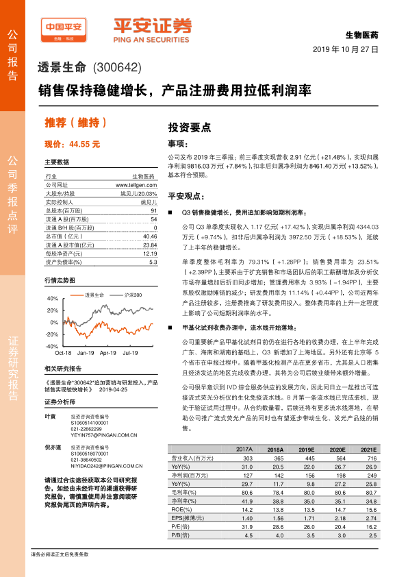 • 透景生命2019年三季报显示,公司销售收入保持稳健增长,但受产品注册费用和销售费用增加的影响,短期利润率有所下降。