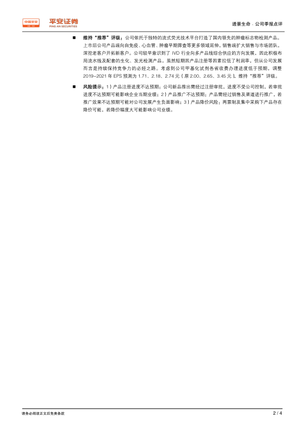 • 维持“推荐”评级。考虑到公司甲基化试剂各省收费办理进度低于预期,调整2019-2021年EPS预测为1.71、2.18、2.74元(原2.00、2.65、3.45元)。