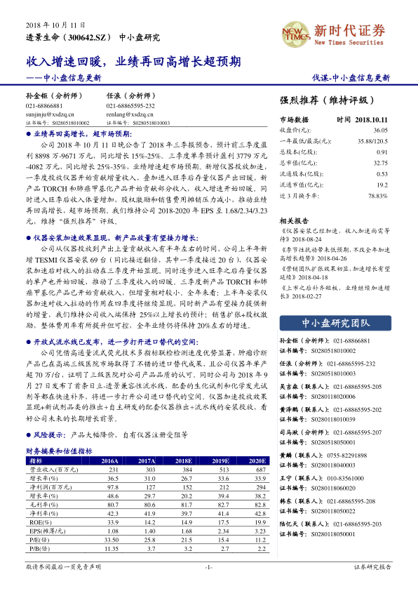 公司于2018年10月11日晚间公告了2018年三季报预告,预计前三季度归母净利润为8898万-9671万元,同比增长15%-25%。其中,第三季度单季预计盈利3779万-4082万元,同比增长25%-35%,业绩增速显著超出市场预期。此次业绩回暖主要得益于新增仪器投放加速,一季度投放的仪器开始贡献增量收入,同时进入旺季后存量仪器产出回暖。此外,新产品TORCH和肺癌甲基化产品也开始贡献部分收入。随着收入体量增加,股权激励和销售费用摊销压力减小,共同推动了业绩的高增长。分析师维持公司2018-2020年EPS预测为1.68/2.34/3.23元,并维持“强烈推荐”评级。