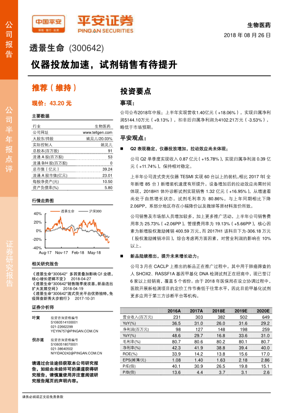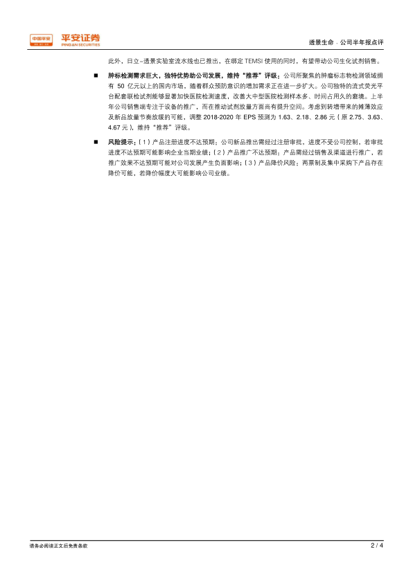 本报告分析了透景生命2018年中报,指出公司营收和利润保持增长,但盈利能力面临挑战。公司通过增加仪器投放和推广新品来提升未来增长动力,尤其是在肿瘤标志物检测领域具有优势。报告同时提示了产品注册、推广和降价等风险,并维持了对公司的“推荐”评级。
