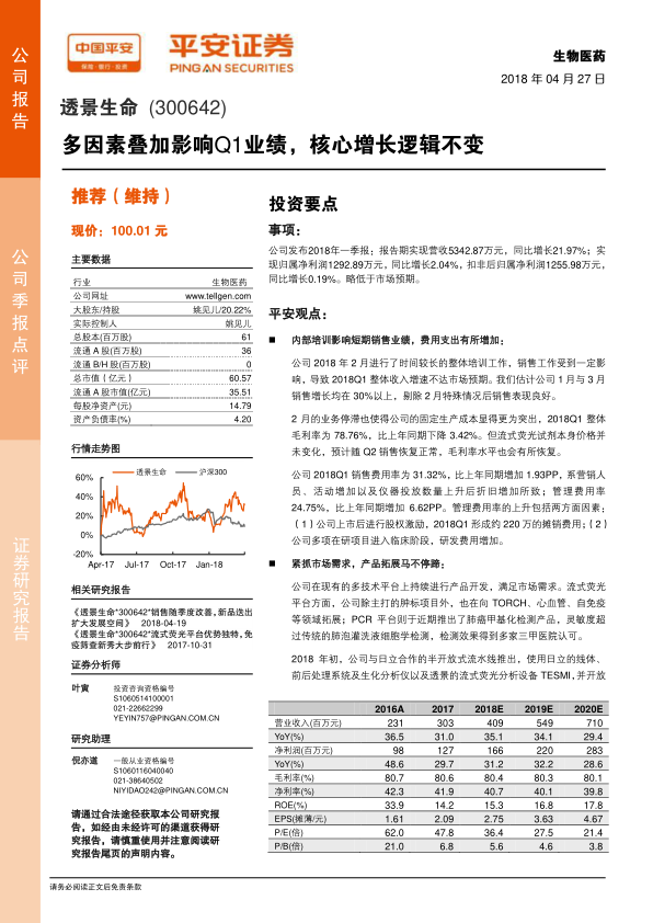 透景生命2018年第一季度业绩表现低于市场预期,主要受内部培训导致的短期销售停滞以及营销和研发费用增加的影响。尽管短期业绩承压,但公司凭借其在流式荧光平台上的独特优势,持续拓展肿瘤标志物、TORCH、心血管、自免疫等检测领域,并积极推出PCR肺癌甲基化检测产品。与日立合作的半开放式流水线进一步强化了公司在市场中的竞争力,有助于加深客户绑定。分析师认为,公司核心增长逻辑不变,产品创新和市场拓展将持续驱动未来业绩增长。平安证券维持对透景生命的“推荐”评级,并对其2018-2020年的盈利能力持乐观预测,但同时提示了产品注册、推广及降价等潜在风险。