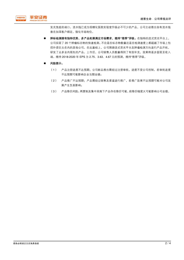 公司在流式荧光平台上实现了20个肿瘤标志物的快速检测,在标志物数量和检测速度上均超越市场竞争对手。在此基础上,公司围绕流式荧光平台及肿瘤检测方向开发了众多业内领先产品。上市后销售人员数量得到有效补充,预计效果将逐步体现在收入端。平安证券维持公司2018-2020年EPS预测分别为2.75元、3.63元、4.67元,并维持“推荐”评级。