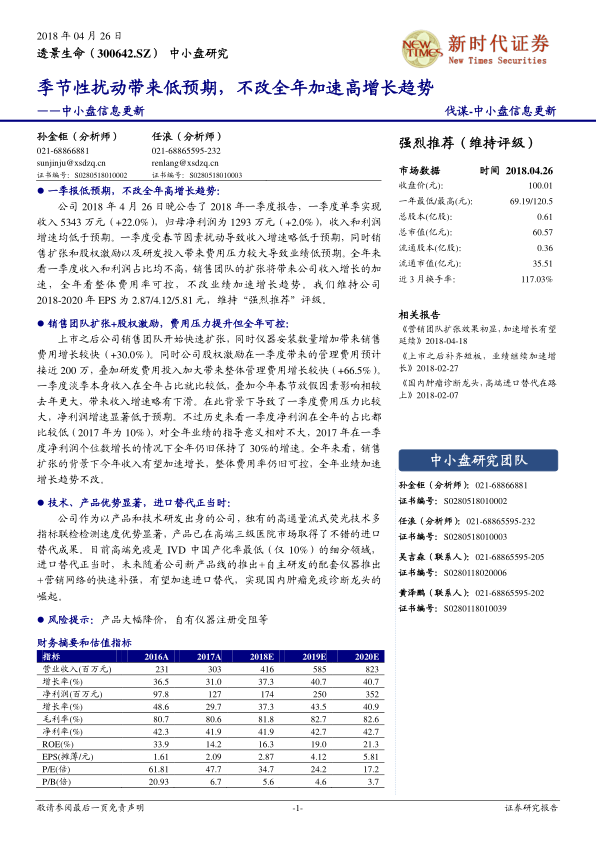 本报告的核心观点是,透景生命2018年一季度业绩受到季节性因素和费用增加的影响,低于市场预期,但全年加速增长的趋势不变。
