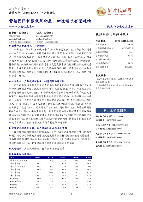 本报告的核心观点是,透景生命2017年业绩符合预期,且呈现加速增长态势。这主要得益于其独特的高通量流式荧光技术优势、上市后销售团队的快速扩张以及产品线的不断拓展。