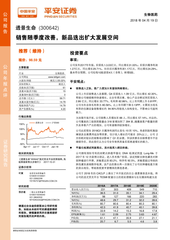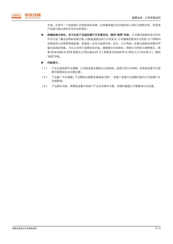 基于公司研发和销售情况,平安证券调整了对透景生命2018-2020年的EPS预测,分别为2.75元、3.63元和4.67元(原预测2018/2019年EPS为2.73/3.59元),并维持“推荐”评级。