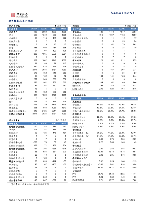 基于抗生素需求回暖,产品量价齐升,海外拓展蓄势待发,增长动力强劲。我们预计公司2023-2025年营收分别为14.19/16.17/22.87亿元,同比增长20.3%/13.9%/41.4%;归母净利润分别为1.41/1.86/2.44亿元,同比增长35.1%/31.7%/31.2%;对应PE分别为24x/19x/14x,维持“增持”评级。